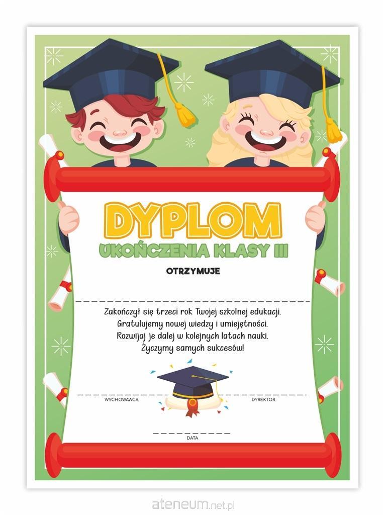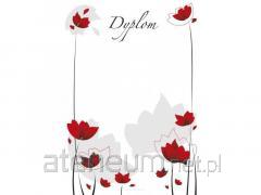 Dyplom w formacie A4 (30cm x 21cm), wydrukowany na grubym papierze 300g.