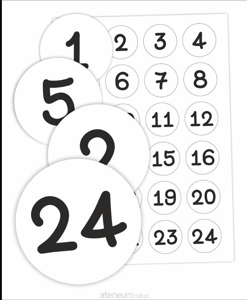 Zestaw składa się z 24 naklejek z cyferkami o średnicy ~ 40 mm.