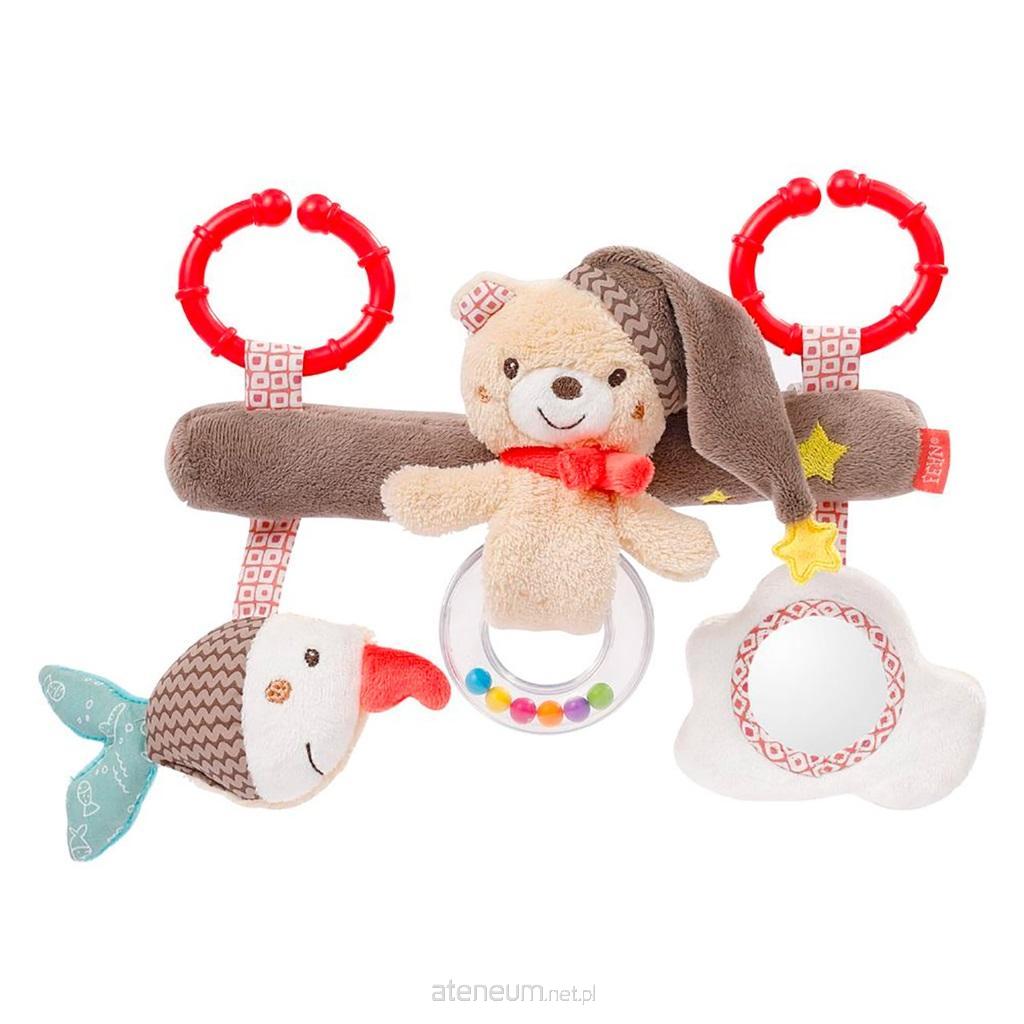 Zabawka nadająca się do zamontowania na poręczy każdego wózka, łóżeczka lub kojca. Aksamitnie delikatna w dotyku, z trzema zawieszkami: pluszowym Misiem Bruno z grzechotką - pierścieniem wypełnionym tęczowymi paciorkami, Rybą Piłą z piszczałką oraz Chmurką z bezpiecznym lusterkiem. Zabawka służy do oglądania, chwytania i znakomitej zabawy oraz trenowania koordynacji ręka-oko.