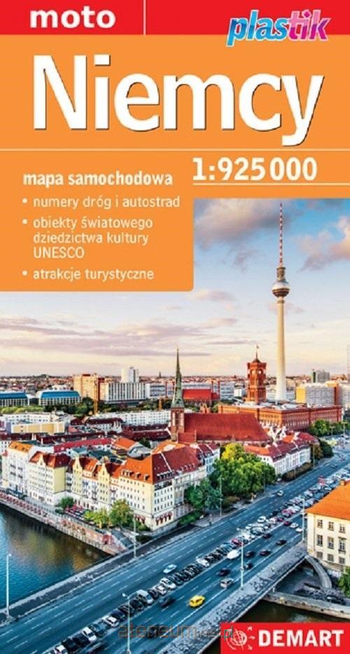 Mapa samochodowa Niemiec z numeracją dróg i autostrad, wzbogacona o dodatkowe treści: obiekty światowego dziedzictwa kultury UNESCO, miejsca interesujące turystycznie.