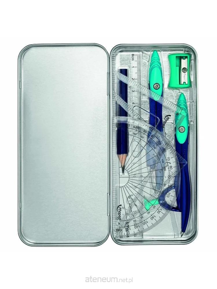 9-elementowy, w metalowym pudełku, zawierający: 2 metalowe cyrkle w kolorze granatowo-zielonym - jeden z uniwersalnym uchwytem na ołówek, a drugi na grafity o grubości 2 mm; linijkę; 2 ekierki; kątomierz; gumkę; ołówek i temperówkę.