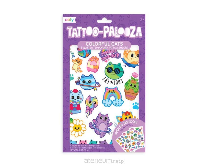 Zestaw tatuaży z kotami zawiera 3 arkusze z zabawnymi, błyszczącymi kocimi przyjaciółmi. To ponad 50 tatuaży z kotkami w różnych kolorach, pozach, strojach i miejscach. Tatuaże są łatwe w aplikacji i utrzymują się do 5 dni.