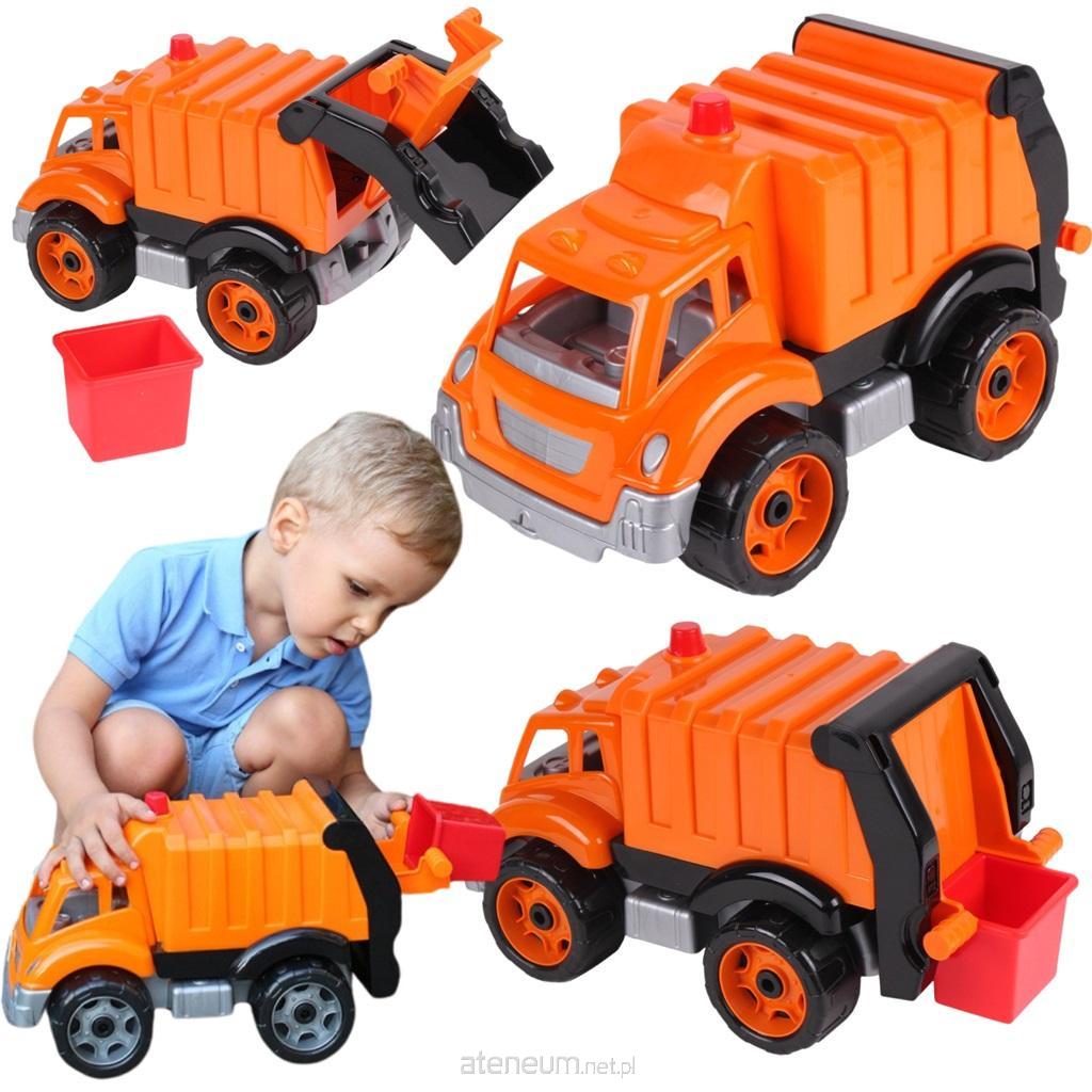 Pojazd- śmieciarka ze zbiornikiem na śmieci i ruchomą pokrywą.
