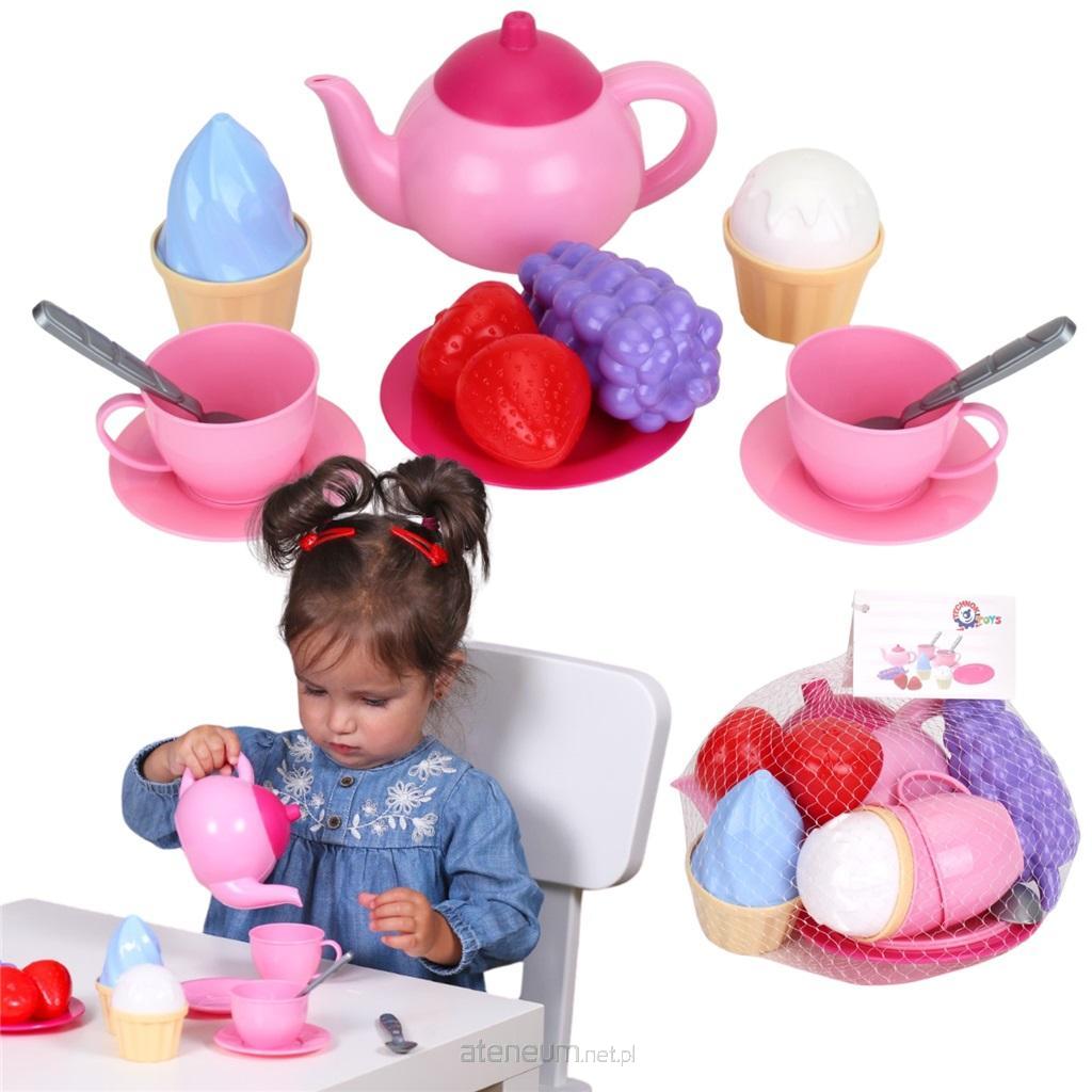 W skład zestawu wchodzą: czajniczek z pokrywką, 2 filiżanki ze spodeczkami i łyżeczkami, 2 babeczki ze śmietaną, talerz, winogrona, 2 truskawki. Opakowanie to siatka z kolorową tekturową etykietą.