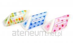 Każda gumka jest zapakowana w kartonową owijkę i folię, która chroni gumkę przed brudem i kurzem. .