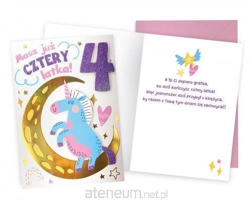 Karnet Dream Cards Plus "Urodziny 4" DKP-038 w powiększonym tzw. Angielskim formacie 140x190 mm. Kartka z ozdobnej serii Dream Cards Plus na czwarte urodziny robi wrażenie dzięki atrakcyjnej kolorystyce i ciekawym zdobieniom. To idealny wybór łączący przyjazną cenę z jakością. Cechy szczególne: wielkość: 145 x 195 cm po złożeniu kopertą, wnętrze: kolorowe, wyjątkowe życzenia w środku, w komplecie: dopasowana kolorystycznie koperta. zdobienia: różnorodne, bogate (w zależności od wzoru: przyklejane dekoracje, elementy biżuteryjne, odstawniki, brokat, metaliczne folie, tłoczenia itp.), okazja: urodziny, 4 urodziny