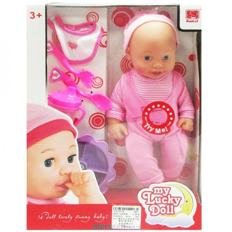 Lalka w niebieskiej piżamie pije, butelka, nocnik