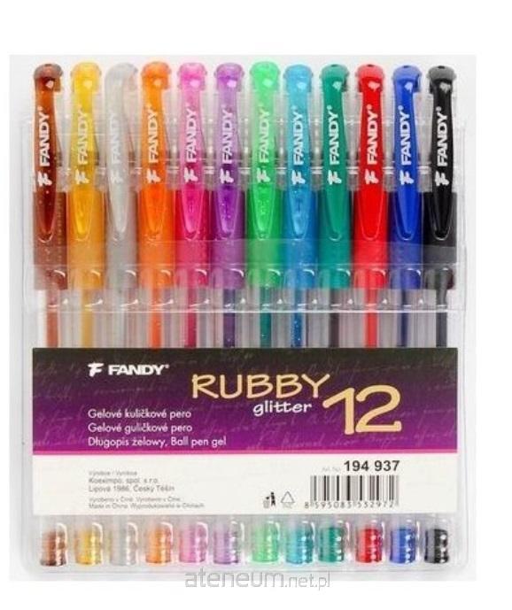 Zestaw 12 plastikowych długopisów żelowych, gumowy uchwyt zapewniający wygodny chwyt, 8 brokatowych + 4 kolory podstawowe, szerokość linii 0,7 mm