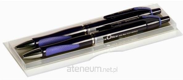 Zestaw plastikowego długopisu i ołówka automatycznego, gumowy uchwyt zapewniający wygodne trzymanie, wymienny wkład F-411 needle z igłową końcówką do bardzo cienkiego pisania, szerokość linii 0,5 mm, niebieski kolor tuszu (długopis), grafit 0,5 mm, końcówka wysuwana (ołówek automatyczny), pudełko upominkowe.