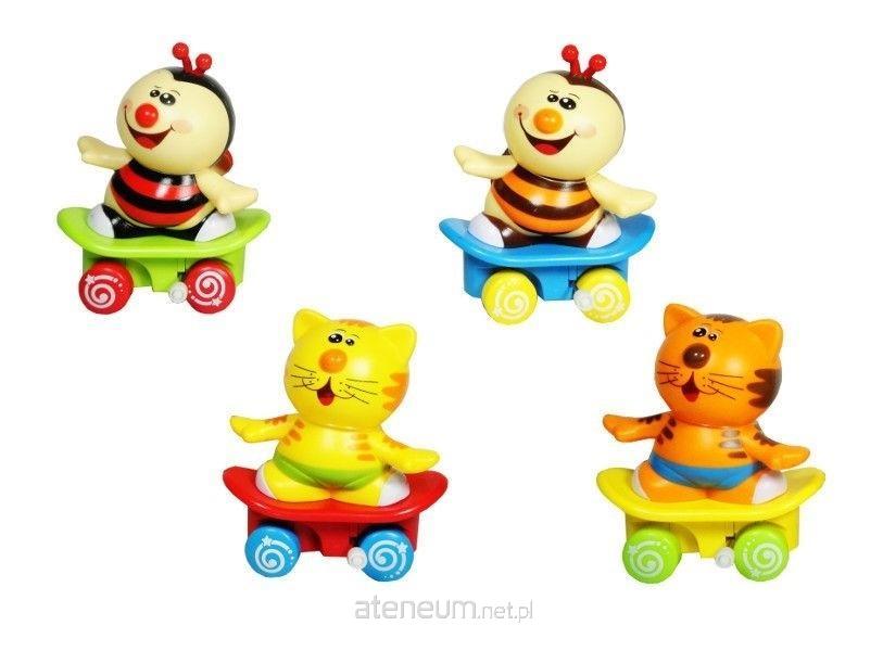 Kolorowe zwierzątka - biedroneczki i kotki na deskorolkach. Po nakręceniu zabawki koła deskorolki zaczynają się kręcić.