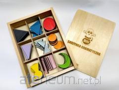 - 70 kolorowych wielokątów: 10 sześciokątów, 5 prostokątów, 10 kwadratów, 15 trapezów, 15 rombów, 15 trójkątów;