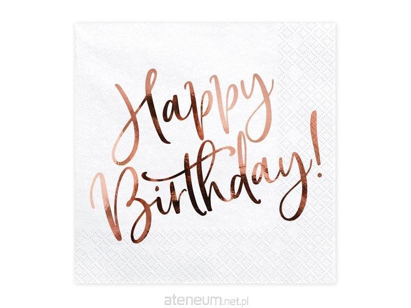 Serwetki papierowe w kolorze białym, z metalizowanym napisem Happy Birthday w kolorze różowego złota, wymiary po rozłożeniu ok. 33 x 33 cm, wymiary po złożeniu ok. 16,5 x 16,5 cm.(1 op. / 20 szt.)
