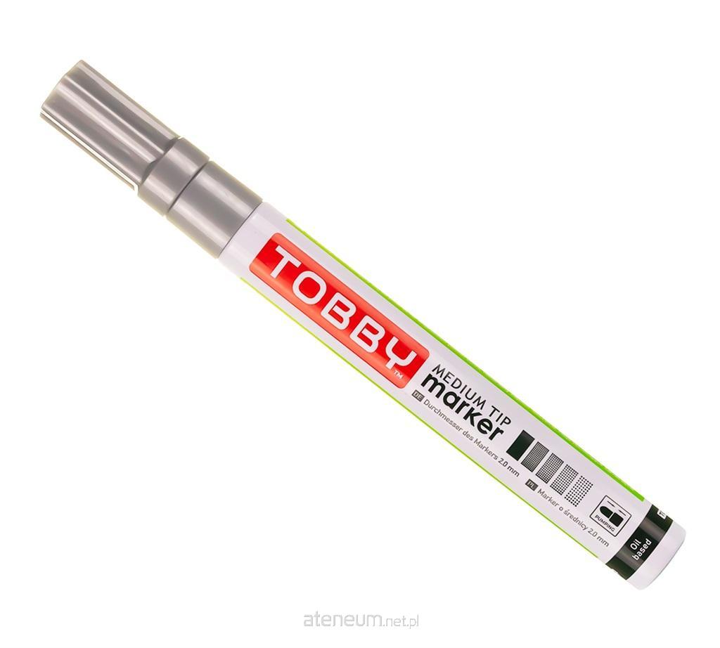 Permanentny Marker olejowy TOBBY Kolor: srebrny Wodoodporny i szybkoschnący tusz na bazie alkoholi. Bez problemu możemy nim pisać po powierzchniach ze stali, gumy, szkła, drewna, plastiku itp. Cechy: - Przeznaczony do stali, gumy, drewna, plastiku, szkła i innych powierzchni - Dobrze kryjący, trwały, niezmywalny wodą, nieblaknący, odporny na różne warunki atmosferyczne (woda, promienie UV) - Okrągła końcówka 2,0 mm - Marker olejny (lakierowy) posiada pompkę do tuszu, którą, przed pierwszym użyciem, należy pompować, aż spłynie tusz, (po wcześniejszym mocnym wstrząśnięciu markera)