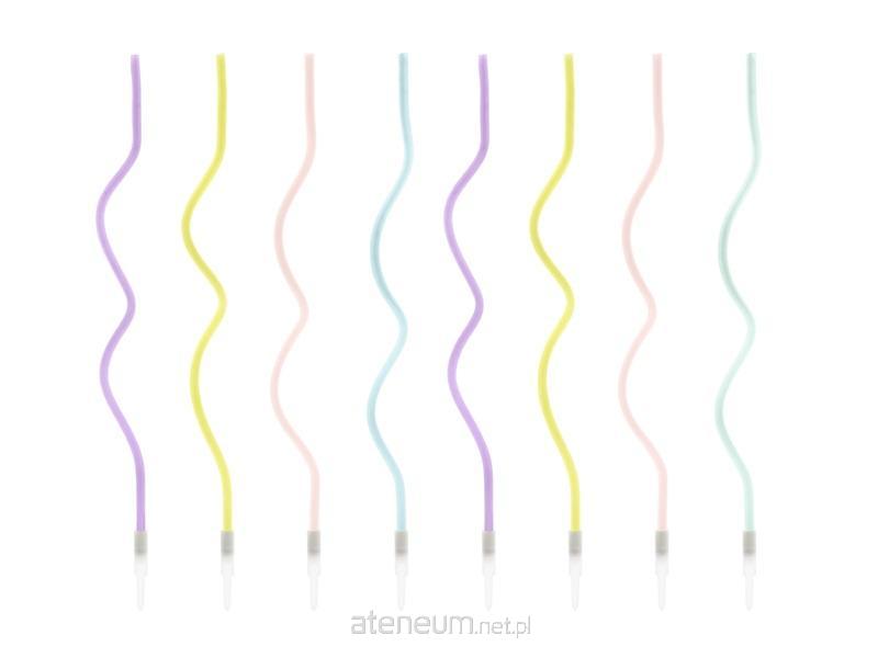 Świeczki urodzinowe zakręcone, mix kolorów (żółty, różowy, niebieski, fioletowy, zielony), wysokość ok. 14 cm. Zestaw zawiera 8 świeczek i podstawek.(1 op. / 8 szt.)
