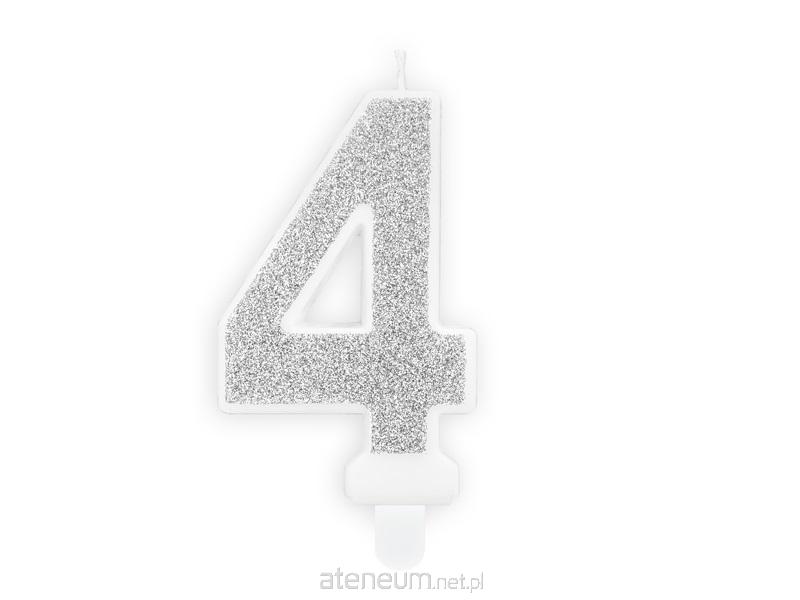 Świeczka urodzinowa Cyferka 4 w kolorze srebrnym brokatowym, rozmiar ok. 7 cm.