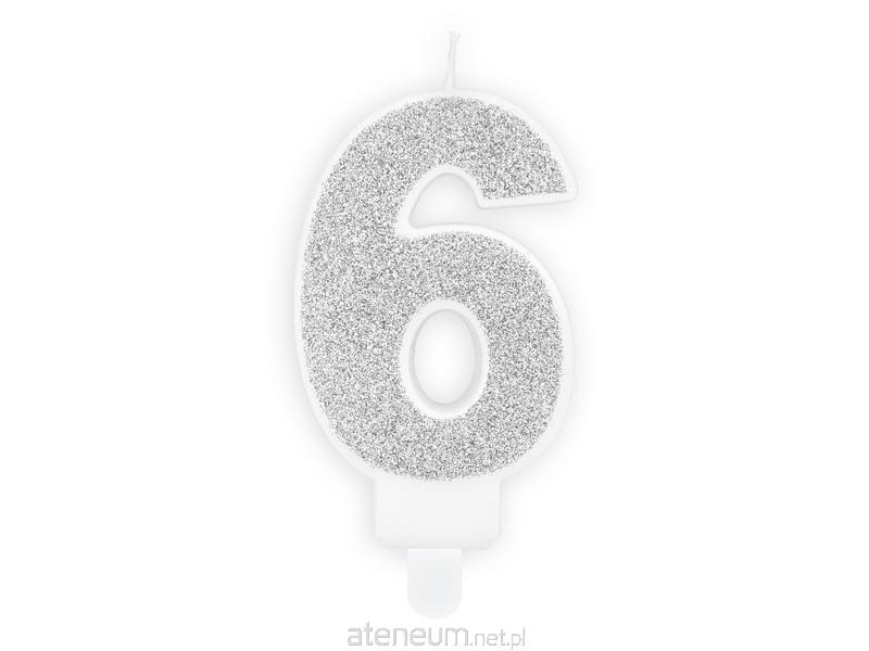 Świeczka urodzinowa Cyferka 6 w kolorze srebrnym brokatowym, rozmiar ok. 7 cm.