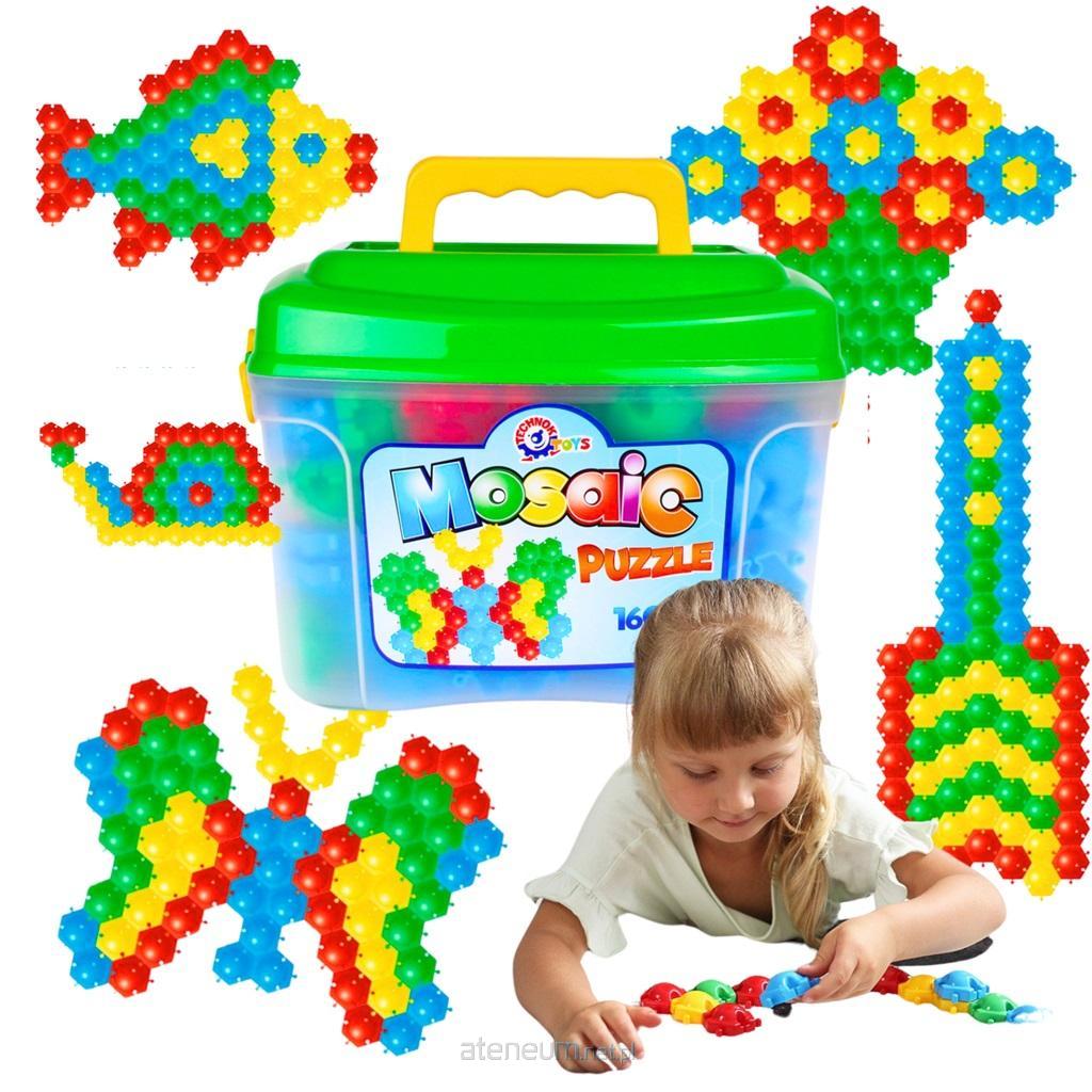 Mozaika składa się z kolorowych sześciokątów (160 części), z których dziecko może ułożyć dowolne kształty i wzory.