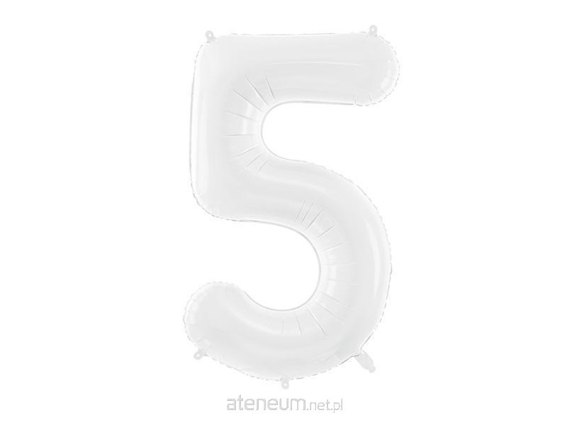 Balon foliowy Cyfra ''5'' w kolorze białym, rozmiar przed napompowaniem ok. 100 cm (39''), rozmiar po napompowaniu ok. 86 cm (34''). Do napompowania helem i powietrzem. Do napompowania helem i powietrzem. Zestaw zawiera słomkę.