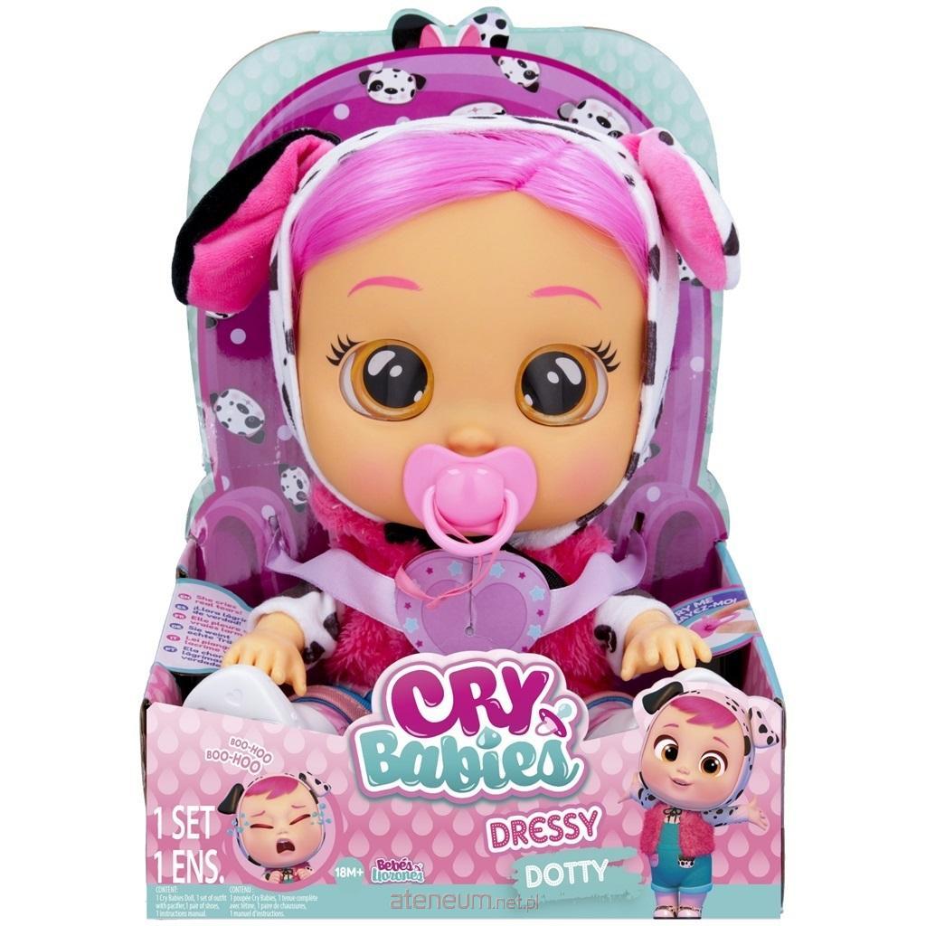 Cry Babies Dressy - nowe i ulepszone: długie kolorowe włosy, szklane oczy, zdejmowane ubranka i butki, bardziej miękka twarz, lżejsza waga niż poprzednie Cry Babies!