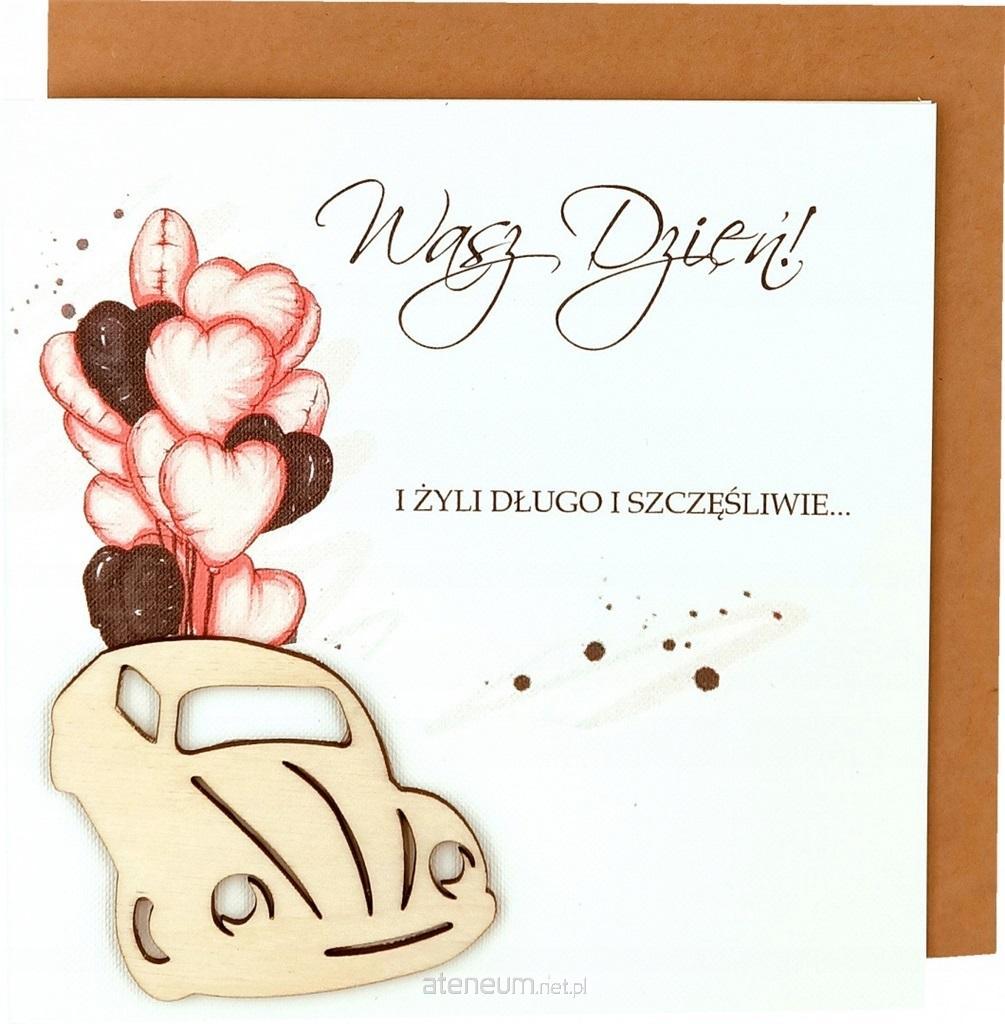 Kartka okolicznościowa z okazji Ślubu o treści: "Z Bożej woli połączeni węzłem, co dwoje serc tych splata, żyjcie szczęśliwie tu na ziemi, niech Wam w miłości płyną lata. Niech miłość, dobroć oraz ufność, która dziś w sercach Waszych gości wraz z Bożą łaską i pomocą da Wam moc szczęścia i radości. Młodej parze z najlepszymi życzeniami