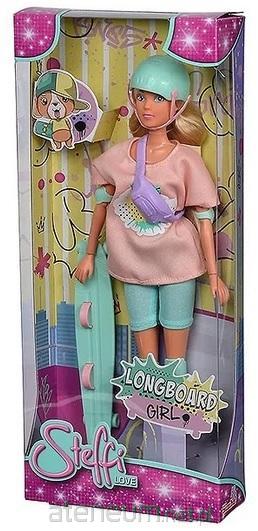 Steffi w modnym, sportowym stroju, z deską longboard, ochraniaczami i torebką na ramię. Wysokość lalki: około 29 cm.