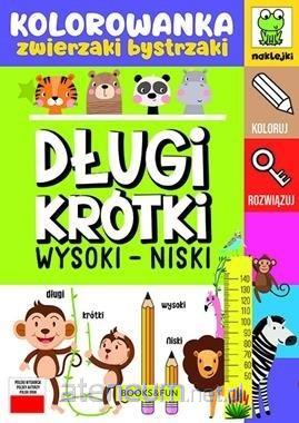 Zwierzaki bystrzaki. Długi krótki to kolorowanka, w której dzieci mogą poćwiczyć rozpoznawanie i opisywanie wielkości przedmiotów oraz porządkowanie ich zgodnie z rozmiarem. Rozwiązując proste zadania, kolorując obrazki i naklejając naklejki, będą się uczyć i bawić.