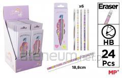 Ołówki grafitowe serii HB, wykonane z czarnego drewna lipowego. Posiadają kolorową gumkę (biała, zielona, różowa, liliowa i czarna). Kształt sześciokątny, pręcik o średnicy 2,2 mm. HB to średnia twardość grafitu, zalecana do pisania i rysowania. Drewno z ekologicznych plantacji.