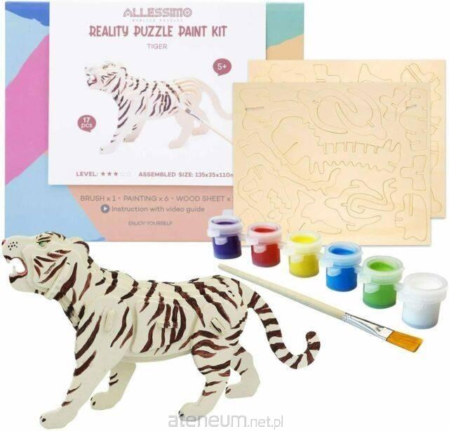 Drewniane puzzle 3D w kształcie tygrysa, wykonane z wysokiej jakości sklejki. Opakowanie zawiera pędzelek oraz farby akrylowe, którymi można pomalować model po złożeniu. Zestawy mają postać arkuszy z wstępnie wyciętymi i ponumerowanymi elementami, które przed montażem należy oddzielić od wykroju, a następnie połączyć bez użycia kleju, zgodnie ze szczegółową instrukcją dołączoną do opakowania. Zabawka edukacyjna pobudzająca dziecięcą wyobraźnię i kreatywność.