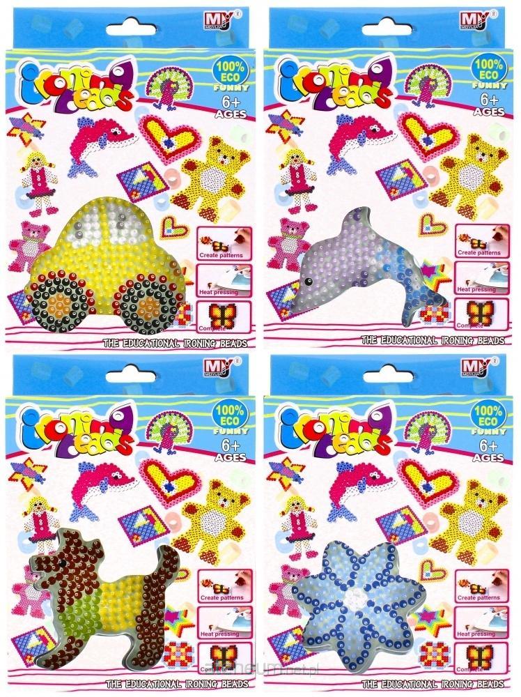Zawartość zestawu: kolorowe koraliki, szablon na którym układa się koraliki, peseta do układania koralików, bibułki do zaprasowywania. Całość wykonana z plastiku.