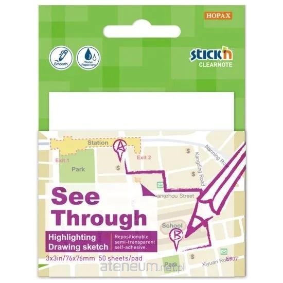 Przezroczysty, bezbarwny notes samoprzylepny zawierający 50 karteczek o wielkości 76 x 76 mm. Przezroczyste karteczki są idealne do odrysowywania małych rysunków. Można też robić na nich krótkie notatki lub zostawiać wiadomości. Po przyklejeniu nie zakrywają treści umieszczonych pod karteczką.