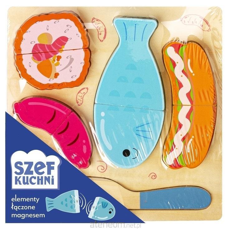 Zestaw "Szef kuchni" rozwija wyobraźnię, kreatywność oraz motorykę dziecka. Zabawa zestawem daje możliwość poznania owoców, warzyw i przekąsek, zachęca do gotowania oraz nauki o zdrowym odżywianiu. Wszystkie elementy wykonane są z drewna, pokryte bezpieczną dla dzieci farbą. Elementy połączone magnesem.