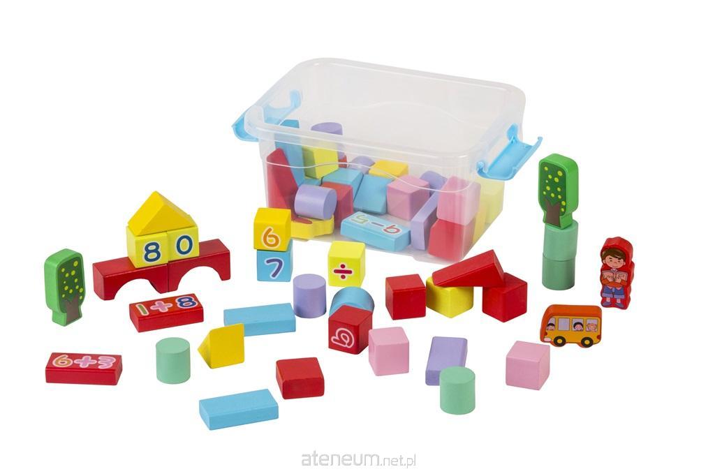 Zestaw 53 sztuk kolorowych klocków zapakowanych w plastikowy pojemnik z rączką. Dzięki różnorodnym kształtom z klocków można zbudować niezliczona ilość konstrukcji. Do zestawu dołączona została instrukcja z wzorami.