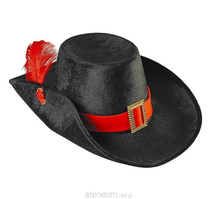 KAPELUSZ MUSZKIETERA Z CZERWONYM PIÓRKIEM Długość: 40 cm Szerokość: 31 cm Średnica: 19,5 cm Wysokość: 12,5 cm Kolor: czarny ze złotą klamerką i czerwonym piórkiem. Materiał: filc.