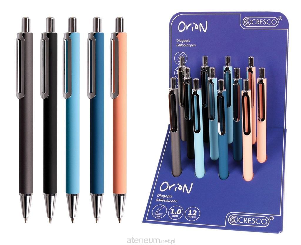 Długopis ORION to kolejna nowość CRESCO. Grubość linii pisania 1 mm. Mechanizm włączania pstrykany. Wykończenia srebrne. Korpus: powierzchnia softowa. Opakowanie zbiorcze display 12szt w mixie kolorystycznym.