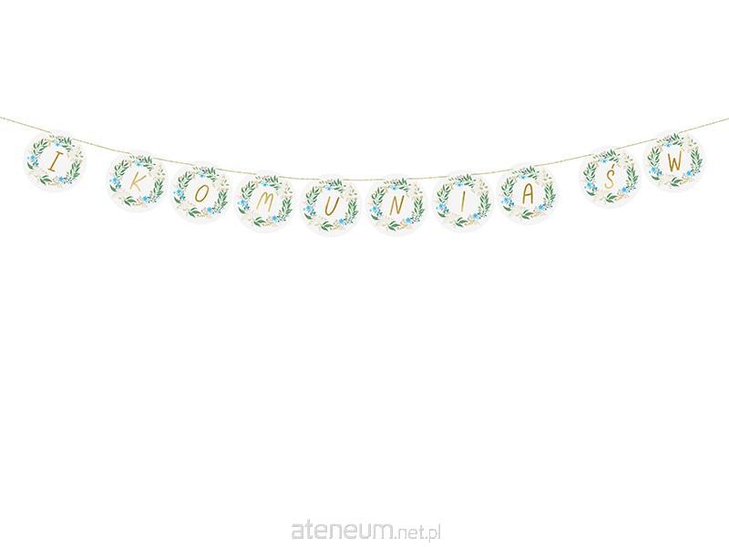 Baner ''I Komunia Św.'' wykonany z papieru, mix kolorów. Wysokość ok. 13 cm, długość sznurka ok. 2 m.