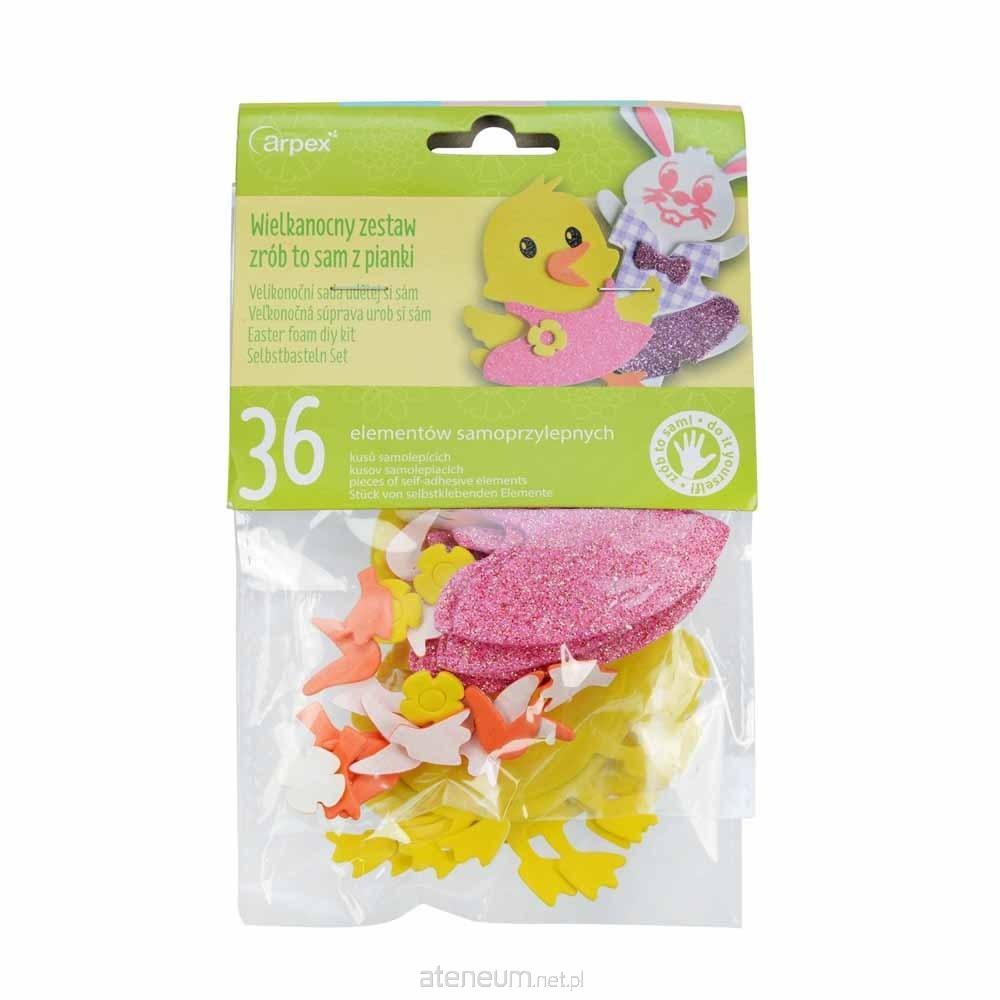 Komplet elementów do samodzielnego wykonania kurczaczka lub króliczka. W skład zestawu wchodzi 36 piankowych elementów samoprzylepnych do stworzenia 6 kompletnych zwierzaków.