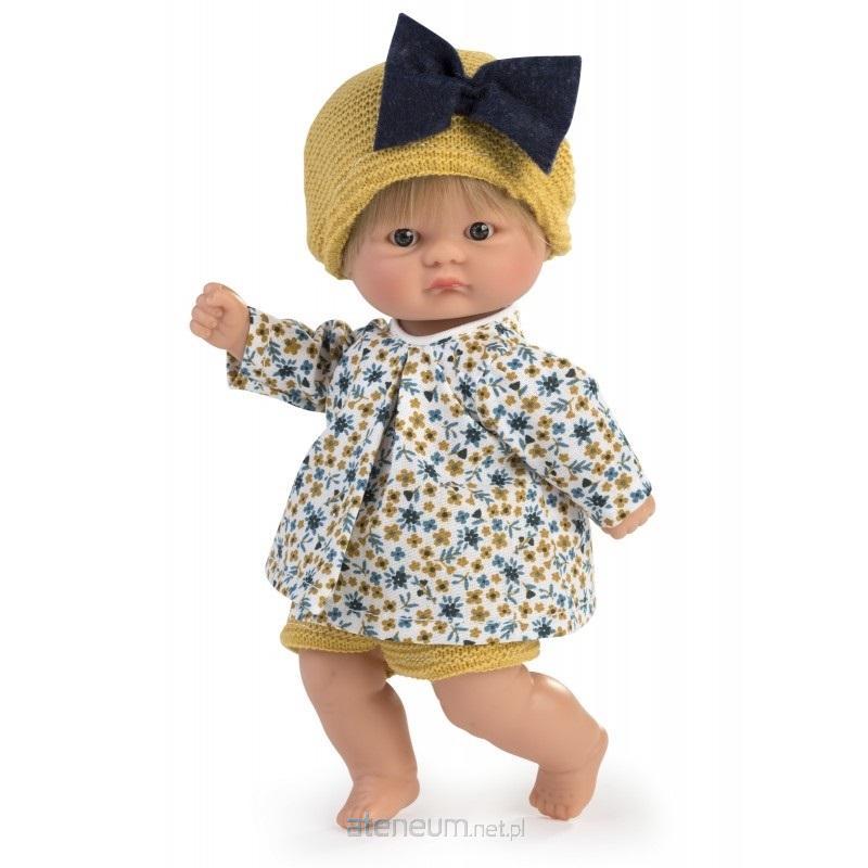 Bomboncin ubrany jest w białą sukieneczkę ozdobioną żółtym oraz zielonym motywem w kwiaty. Producent zadbał również o bieliznę i wyposażył małą laleczkę w miodowe dzianinowe spodenki na gumce. Kwiecista kreacja zapinane jest z tyłu na rzep co ułatwi dziecku zdejmowanie stroju, a zabawa w przebieranie stanie się jeszcze ciekawsza. Stylizację lalki uzupełnia miodowa czapeczka wykonana z przyjemnej w dotyku dzianiny, a jako element dekoracyjny przyszyto z boku dużą granatową kokardę.