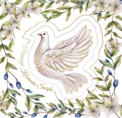Składany z trzech stron kwadratowy karnet o wymiarach 15 x 15 cm z wyciętym elementem na froncie. Złocony i tłoczony, teksy życzeń w środku. Wydrukowany na wysokiej jakości papierze. W zestawie koperta.