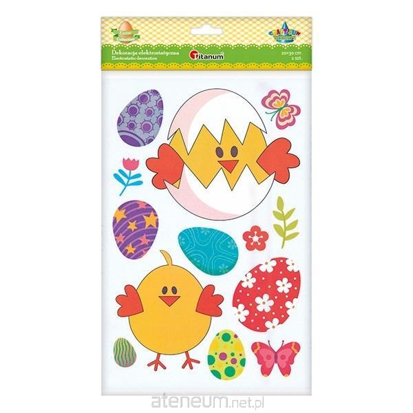 Dekoracje bezklejowe, wielokrotnego użytku - można je zdjąć i przykleić ponownie do gładkich powierzchni takich jak szyby, lustra. Przed montażem powierzchnię, na której będzie dekoracja, należy zrosić wodą z kilkoma kroplami płynu do mycia naczyń, najlepiej za pomocą spryskiwacza, usunąć folię ochronną, ułożyć dekorację na docelowej powierzchni, wycisnąć resztki wody spod dekoracji za pomocą płaskiego narzędzia i osuszyć dekorację papierowym ręcznikiem. Wzory: kurczaczki, pisanki, motyle. 13 sztuk.