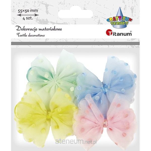 Aplikacje materiałowe kokardki 55x50mm tiulowe w groszki z satynową wstążką 3mm błękitne, jasnozielone, jasnoróżowe, żółte 4szt.