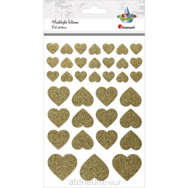Naklejki foliowe: serca brokatowe złote (także strona klejąca). Wymiary: 15 x 14, 27 x 25, 36 x 33 mm, 36szt.