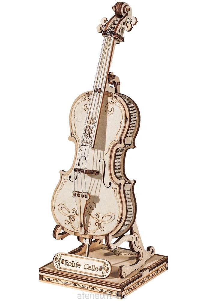 Drewniane puzzle 3D w kształcie wiolonczeli. Zestaw został wykonany z wysokiej jakości sklejki i jest w postaci arkuszy z wstępnie wyciętymi i ponumerowanymi elementami, które przed montażem należy oddzielić od wykroju, a następnie połączyć bez użycia klej, zgodnie ze szczegółową instrukcją dołączoną do opakowania. Dzięki wykorzystaniu nowoczesnej technologii obróbki drewna, model charakteryzuje duża ilość detali, a jego budowa jest ciekawym doświadczeniem (montaż wybranych elementów może wymagać użycia kleju do drewna - zestaw nie zawiera kleju).