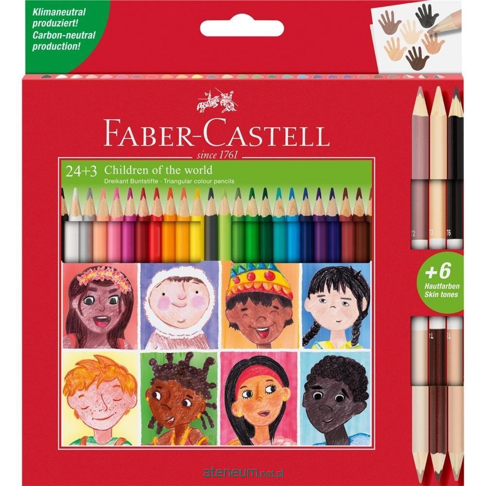 Kredki ołówkowe Faber-Castell 24 szt. w edycji specjalnej z kredkami dwustronnymi Children of the World 3 szt. (6 kolorów) w odcieniach skóry w opakowaniu kartonowym. Klasyczne i doskonałe w swojej prostocie. To wysokiej jakości produkt, w dobrej cenie. Wyraźne i nasycone kolory, specjalnie dobrane przez nauczycieli, optymalnie miękkie i gładkie w aplikacji. Spieralne z większości tkanin. Ergonomiczny trójkątny kształt dla wysokiego komfortu użytkowania i możliwości wygodnej, niestrudzonej artystycznej ekspresji. Grafit kredek jest wysoko odporny na pękanie, dzięki bezpiecznemu procesowi wiązania (SV). Wykonane z certyfikowanego drewna pochodzącego ze zrównoważonego i odpowiedzialnie zarządzanego leśnictwa. Emisja CO2 spowodowana procesem produkcyjnym tych produktów jest neutralizowana przez certyfikowane projekty. Dostępne w różnych kolorach i różnych zestawach.