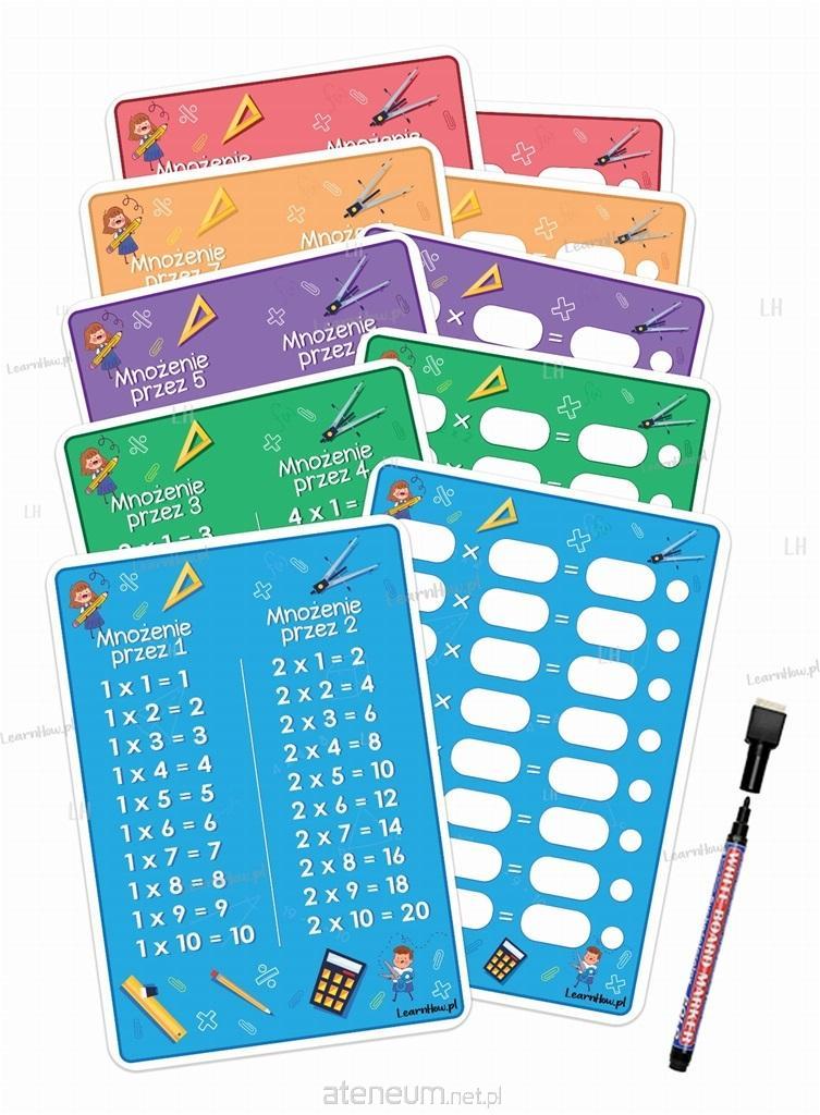 Przednia strona to pełna tabliczka mnożenia w zakresie do 100, strona tylna to 8 pustych pól do utrwalania i ćwiczenia działań.