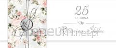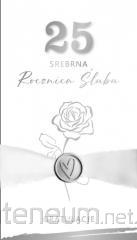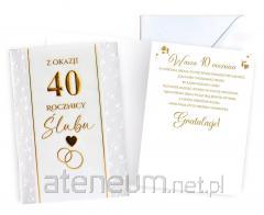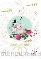 Kartka w powiększonym tzw. Angielskim formacie 140x190 mm. Wykonana z niezwykłą dbałością o szczegóły, zdobiona metalizowaną folią. W środku kartki znajduje się krótki tekst z życzeniami, a pod spodem jest miejsce na własną dedykację. w komplecie: dopasowana kolorystycznie koperta. okazja: Rocznica ślubu