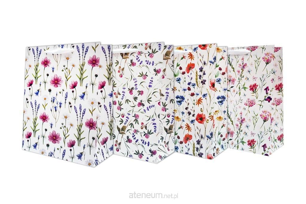 Torebka ozdobna, pionowa, o wymiarach 23x18x10 cm. Dostępna w 4 kwiatowych wzorach, na białym tle. Zamiast sznurka znajduje się ozdobna wstążeczka. Posiada wzmacniany spód.