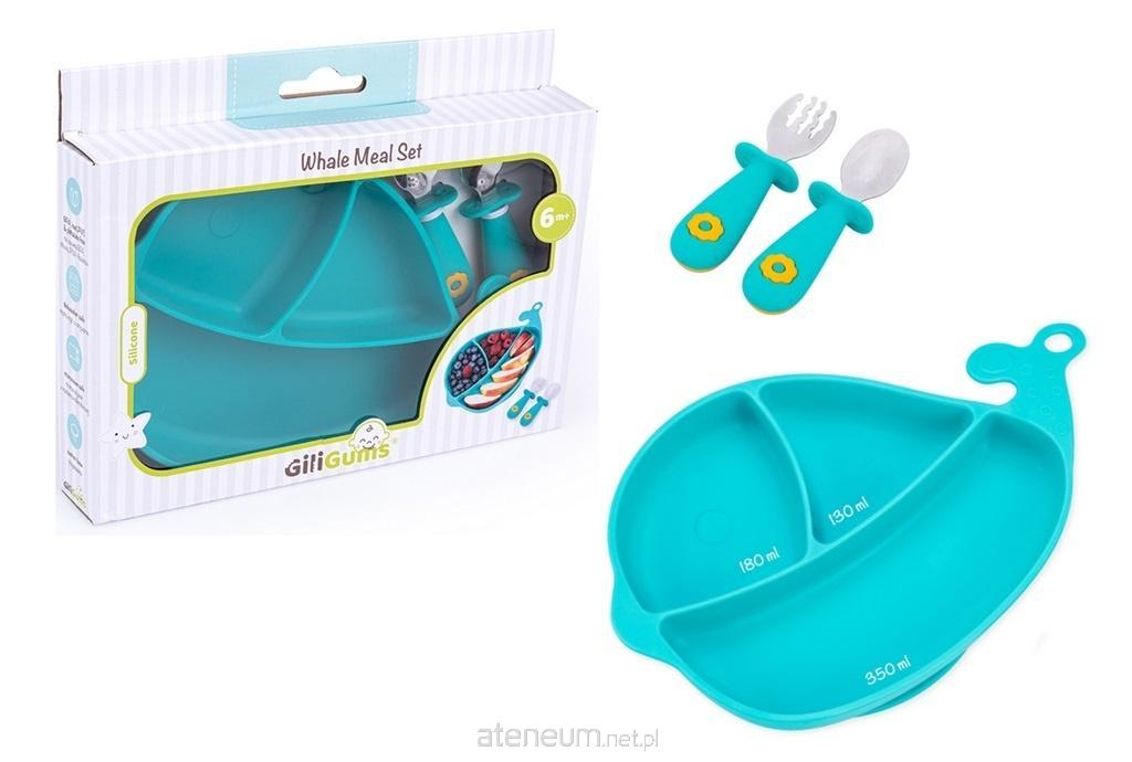 Praktyczny zestaw, który umili posiłki i zachęci najmłodszych do samodzielnego jedzenia! W jego skład wchodzi silikonowy talerzyk w kształcie wieloryba i komplet sztućców (widelec oraz łyżka), wykonanych ze stali nierdzewnej oraz silikonu. Każda z przegródek talerzyka ma inną pojemność, co pozwala na odpowiednie rozmieszczenie poszczególnych elementów posiłku. W postawie talerzyka znajduje się silikonowa przyssawka, która zapobiega przesuwaniu się talerza, ułatwiając tym samym maluchowi spożywanie posiłku. Sztućce wyposażone są w silikonowe uchwyty, które zapobiegają niekontrolowanemu wyślizgiwaniu się łyżki czy widelca z rączki. Zestaw dostępny jest również w kolorze szarym