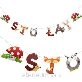 Girlanda papierowa na sznurku z motywem leśnych zwierząt. Zwierzątka układają się w litery tworząc napis "sto lat". Element dekoracyjny przyjęcia urodzinowego dla najmłodszych. Girlanda do samodzielnego złożenia. Całkowita długość girlandy to 250 cm. Produkt zaprojektowano w Polsce.