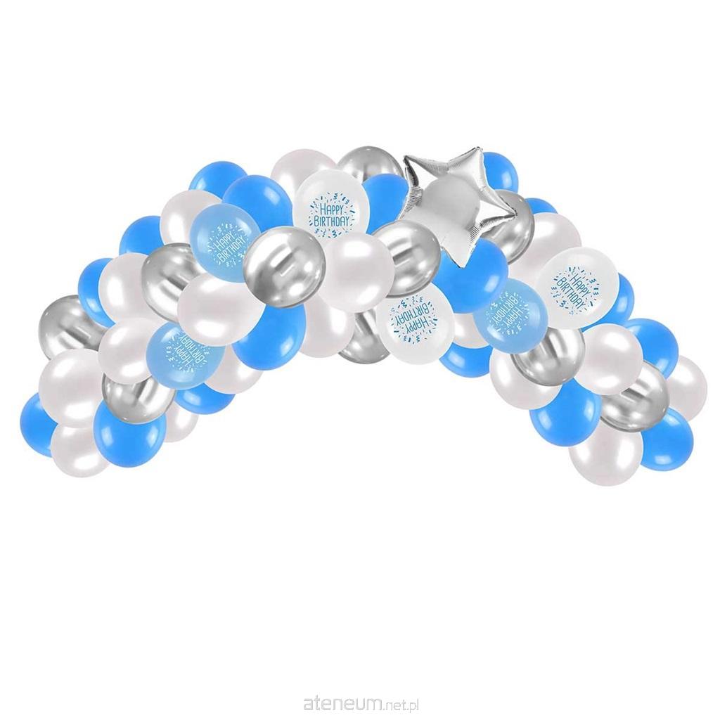 Zestaw dekoracji urodzinowych składający się aż z 53 elementów. To kompletna aranżacja imprezy urodzinowej dla chłopca lub fanów połączenia niebieskiego ze srebrem. W zestawie: - 34 balony lateksowe w kolorach niebieskim (x17) i białym (x17), wielkości 25 cm - 6 balonów lateksowych z nadrukiem napisu Happy Birthday, w kolorach niebieskim (x3) i białym (x3) o wielkości 25 cm - 10 balonów lateksowych z efektem chromu w kolorze srebrnym. Wielkość balonów to 30 cm, - balon foliowy w kształcie gwiazdki w kolorze srebrnym, wielkości 45 cm, - topper na tort urodzinowy z napisem Happy Birthday podkreślający charakter okoliczności. Topper w kolorze srebrnym o wymiarach 13x14 cm, - taśma do girland balonowych długości 5 m