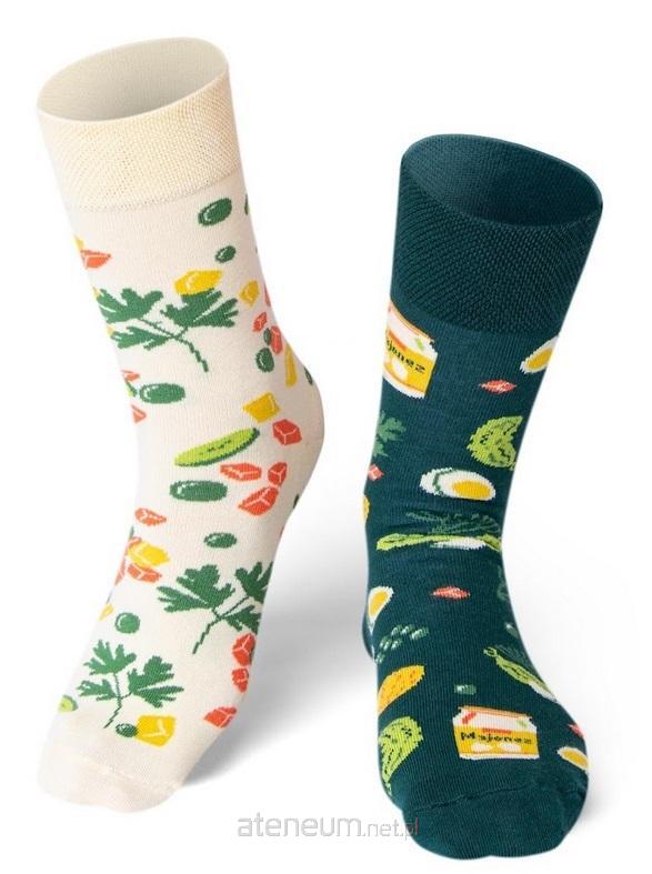 Ziemniaki, pietruszkę i marchewkę ugotować, a następnie obrać. Jajka ugotować na twardo. Ogórki oraz cebulę obrać. Wszystkie składniki pokroić w kostkę i wymieszać z groszkiem. Całość doprawić solą i pieprzem. Wymieszać z majonezem. Niekwestionowana królowa imprez, symbol wielopokoleniowych rodzinnych świąt, strażniczka polskiej tradycji Sałatka jarzynowa! Skarpety SAŁATKA JARZYNOWA to idealny pomysł na prezent dla miłośnika kuchni polskiej i konesera tej wybornej potrawy. Dla waćpani i waćpana Skład: 80% najwyższej jakości bawełna czesana, 17% poliamid (dodaje wytrzymałości), 3% elastan (skarpetka lepiej dopasowuje się do stopy) Nieuciskający ściągacz i komfortowy płaski szew na palcach Wyprodukowano w Polsce Prać zawsze na lewej stronie w temperaturze maks. 40 C, nie prasować.